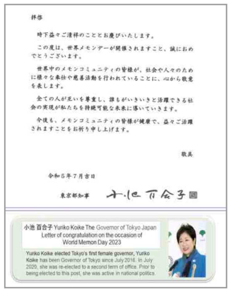 World Memon Day Appreciation Letter from Governor of Tokyo Japan, Yuriko Koike